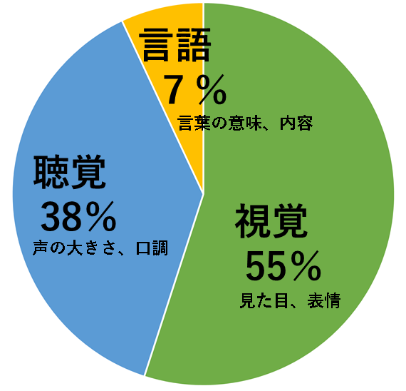 突然ですが、皆さんは「メラビアンの法則」をご存じでしょうか?1971年にアメリカの心理学者、アルバート・メラビアンが提唱した「人がコミュニケーションをとる時に、どんな情報に基づいて印象が決定されるのか」その割合についての法則です。これによると、情報は、「見た目や表情などの”視覚情報”」で55%、「声の大きさや口調などの”聴覚情報”」で38%、そして「言葉そのものの意味や内容といった”言語情報”」で7%の割合で伝達されるというものです。つまり、この法則にしたがうと、人が得る情報は視覚・聴覚から入ってくる情報で93%を占められていることになります。