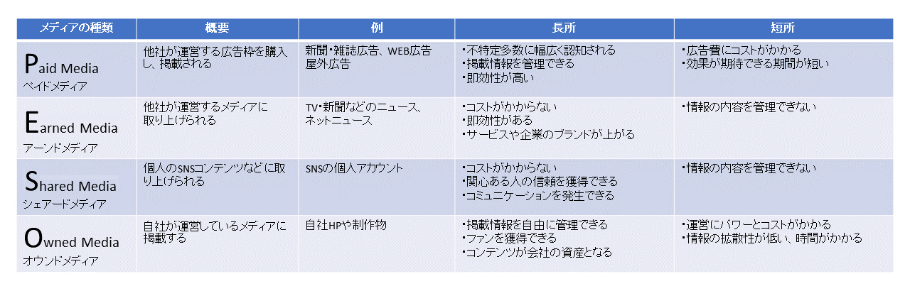前編のおさらいのようになりますが、「PESOモデル」とは「Paid Media(ペイドメディア)」、「Earned Media(アーンドメディア)」「Shared Media(シェアードメディア)」「Owned Media(オウンドメディア)」の4つのメディアを指し、それぞれに図のような特徴があります。